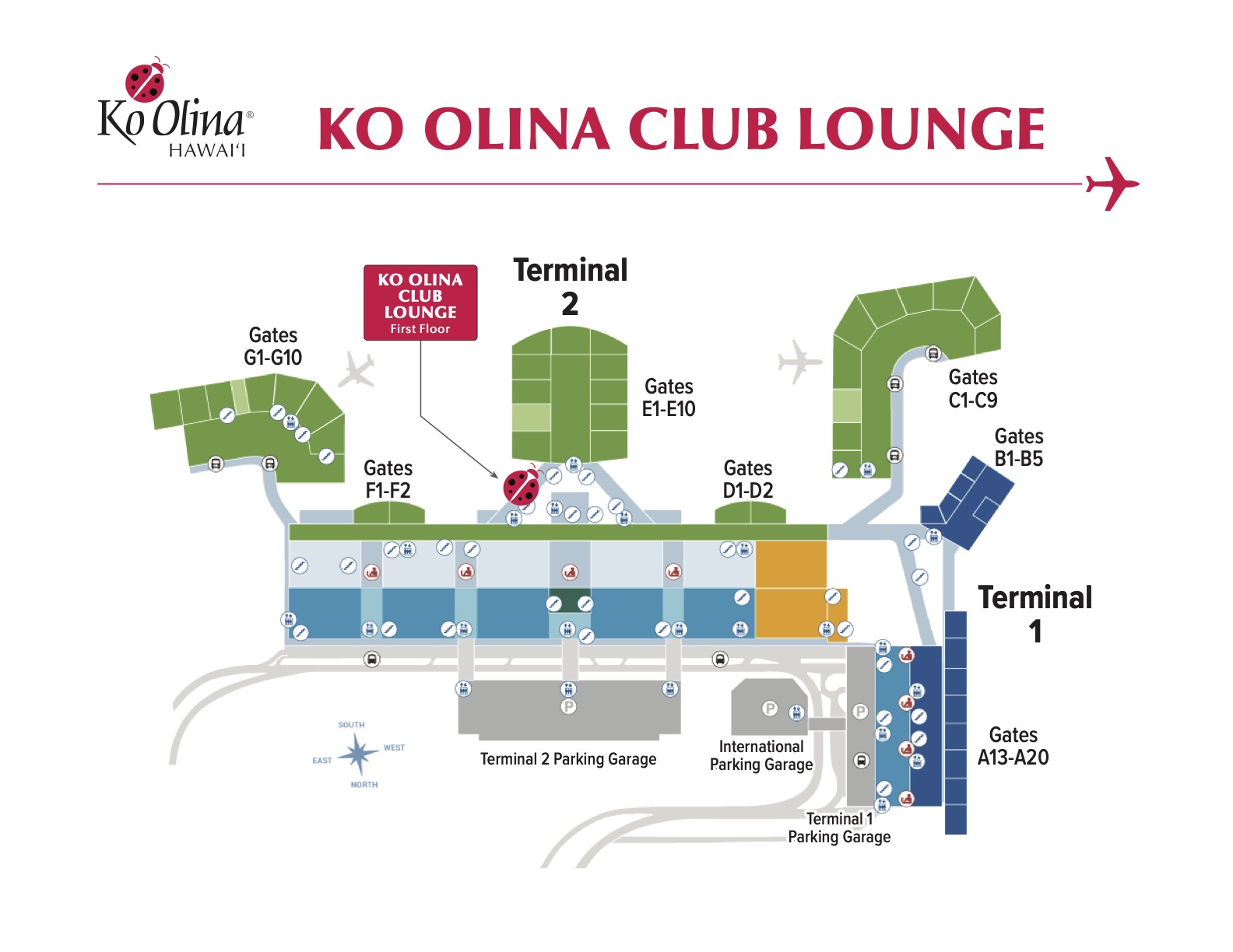 Ko Olina Resort guests can enjoy an exclusive lounge setting and concierge assistance at the Ko Olina Traveler's Lounge located at the Daniel K. Inouye International Airport, Hawai’i’s principal aviation gateway. The Ko Olina Traveler's Lounge is conveniently located on the 1st Floor Garden Court area of the airport's Main Terminal 2 near domestic and international travel gates. (Download Airport Lounge Map)